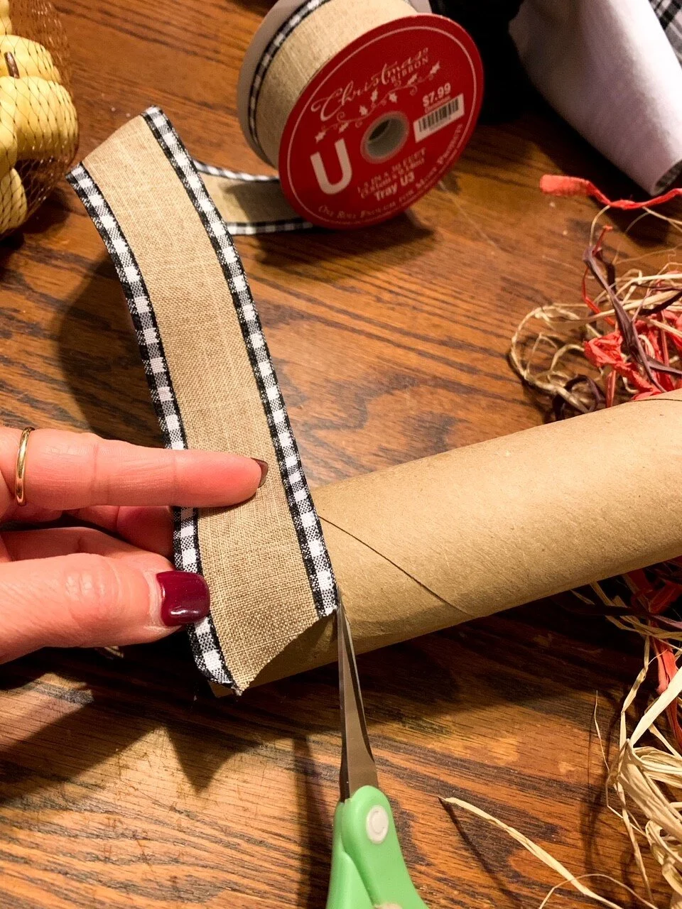 I hot glued the burlap ribbon around the tube. Be careful not to use too much so that it shows through. I also folded the end that overlaps so that there’s no raw edge.